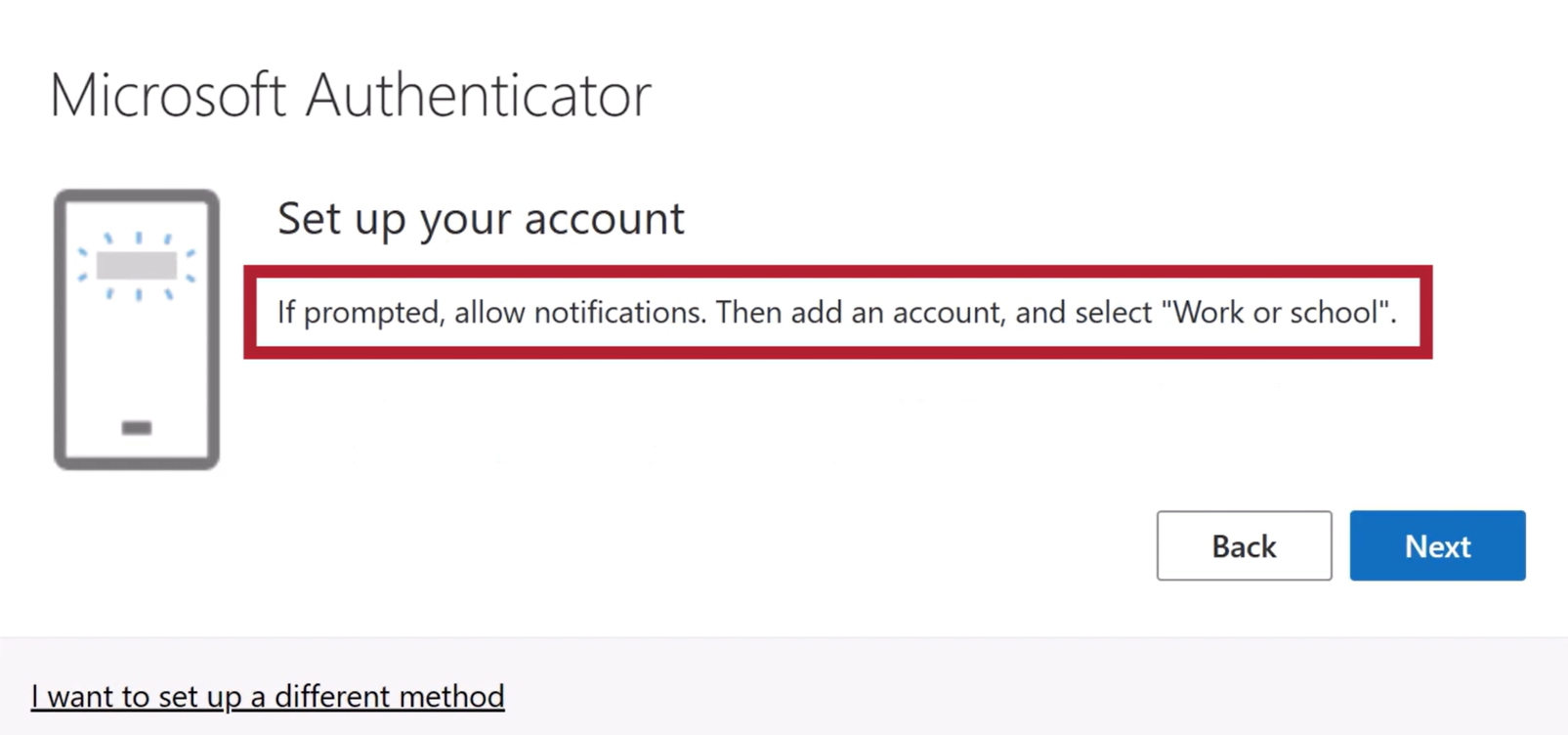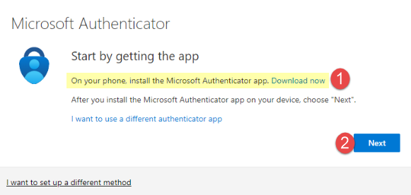 - You will receive a prompt to download the Microsoft Authenticator app on your iPhone or Android device. Once you’ve downloaded the Microsoft Authenticator app on your mobile device, click "Next" on your computer.