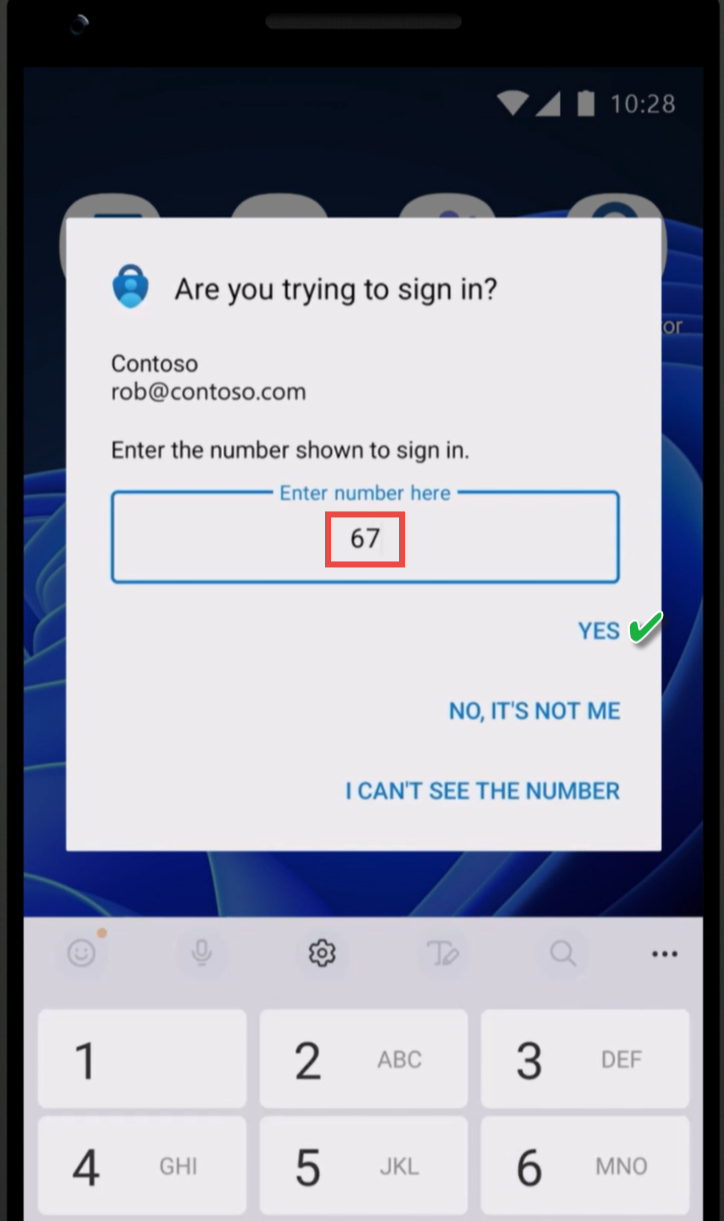 - A randomly generated number will be displayed on your computer. Enter the number you see on your computer into the Microsoft Authenticator app on your phone. (See the images below)