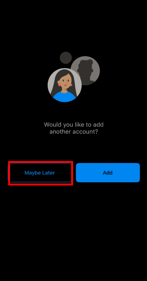 9. Once you've logged in, you'll be prompted to add another account. Tap on Maybe Later to skip this step.